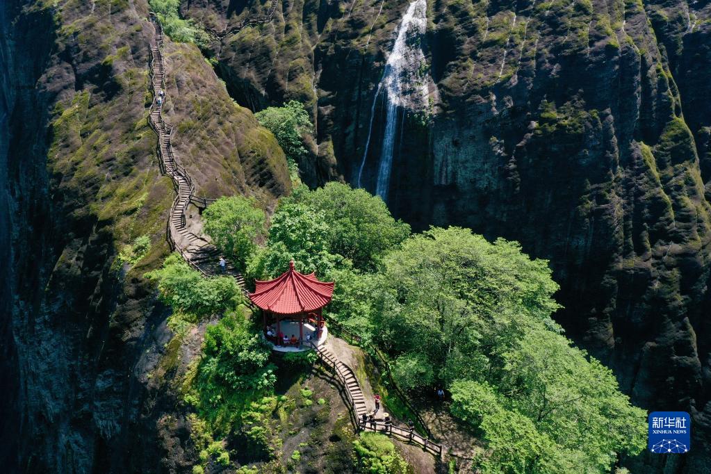 游客在武夷山景區(qū)攀登天游峰(6月6日攝,無人機(jī)照片)。新華社記者 姜克紅 攝