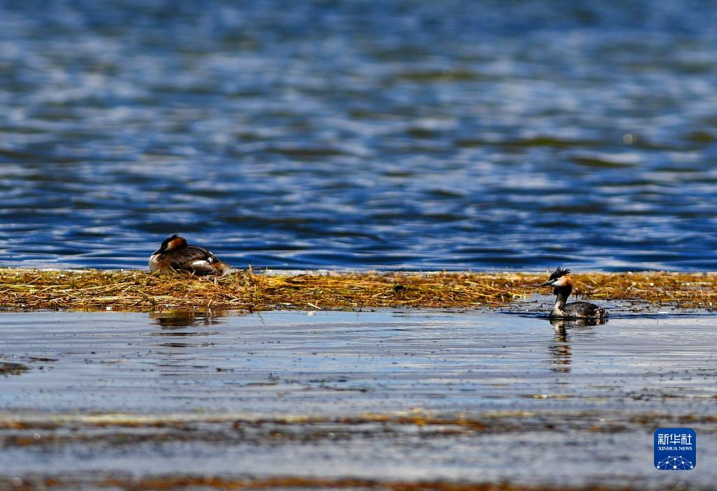 瑪旁雍錯(cuò)湖面上的鳳頭䴙䴘(8月2日攝)。新華社記者 張汝鋒 攝
