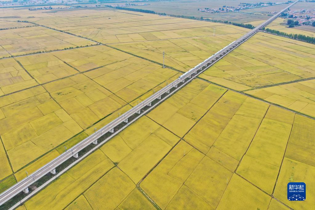 高鐵列車從吉林省公主嶺市沃野間駛過(guò)(2021年9月19日攝,無(wú)人機(jī)照片)。新華社記者 張楠 攝