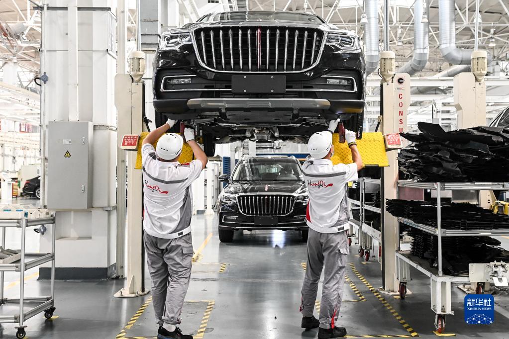 工人在位于吉林長(zhǎng)春的一汽紅旗工廠總裝車間內(nèi)裝配車輛(2021年7月1日攝)。新華社記者 顏麟蘊(yùn) 攝