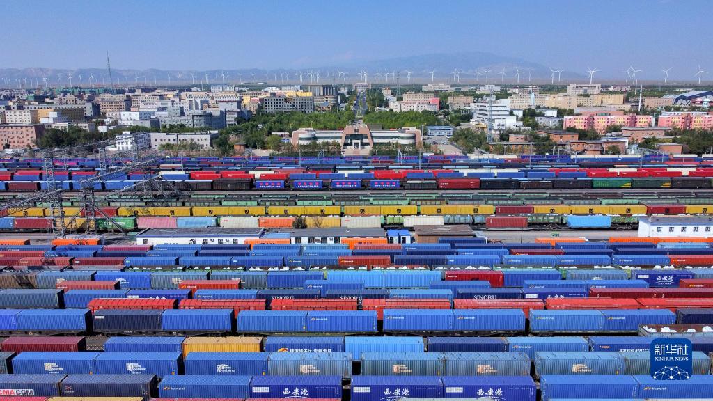 在新疆阿拉山口站寬準軌編組場,出入境中歐班列集結(jié)等待出發(fā)(2022年9月10日攝,無人機照片)。新華社發(fā)(陳乾 攝)