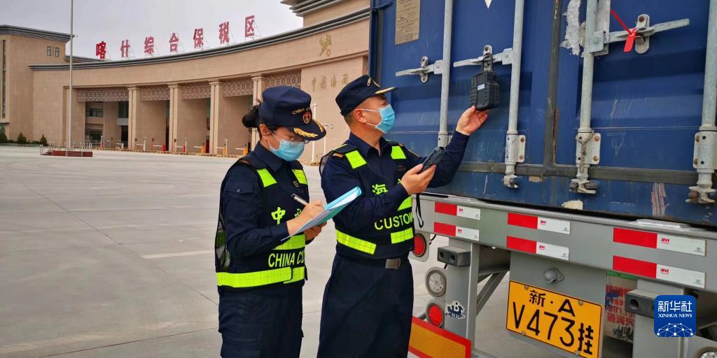 海關現(xiàn)場關員在喀什綜合保稅區(qū)登記入?yún)^(qū)車輛電子鎖信息(2022年9月14日攝)。新華社發(fā)(圖爾罕·麥麥提伊敏 攝)
