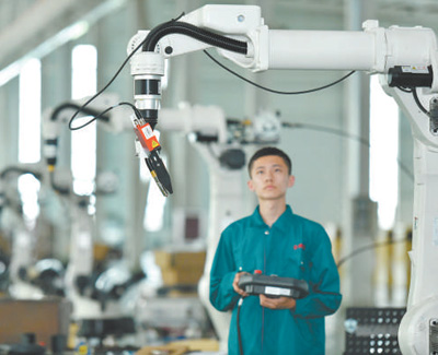 河北省任丘市通過搭建科技創(chuàng)新平臺,建設研發(fā)中心、技術研究院,持續(xù)深化產(chǎn)學研合作交流,推動企業(yè)轉型升級。圖為工作人員在生產(chǎn)車間調(diào)試機器人。 |