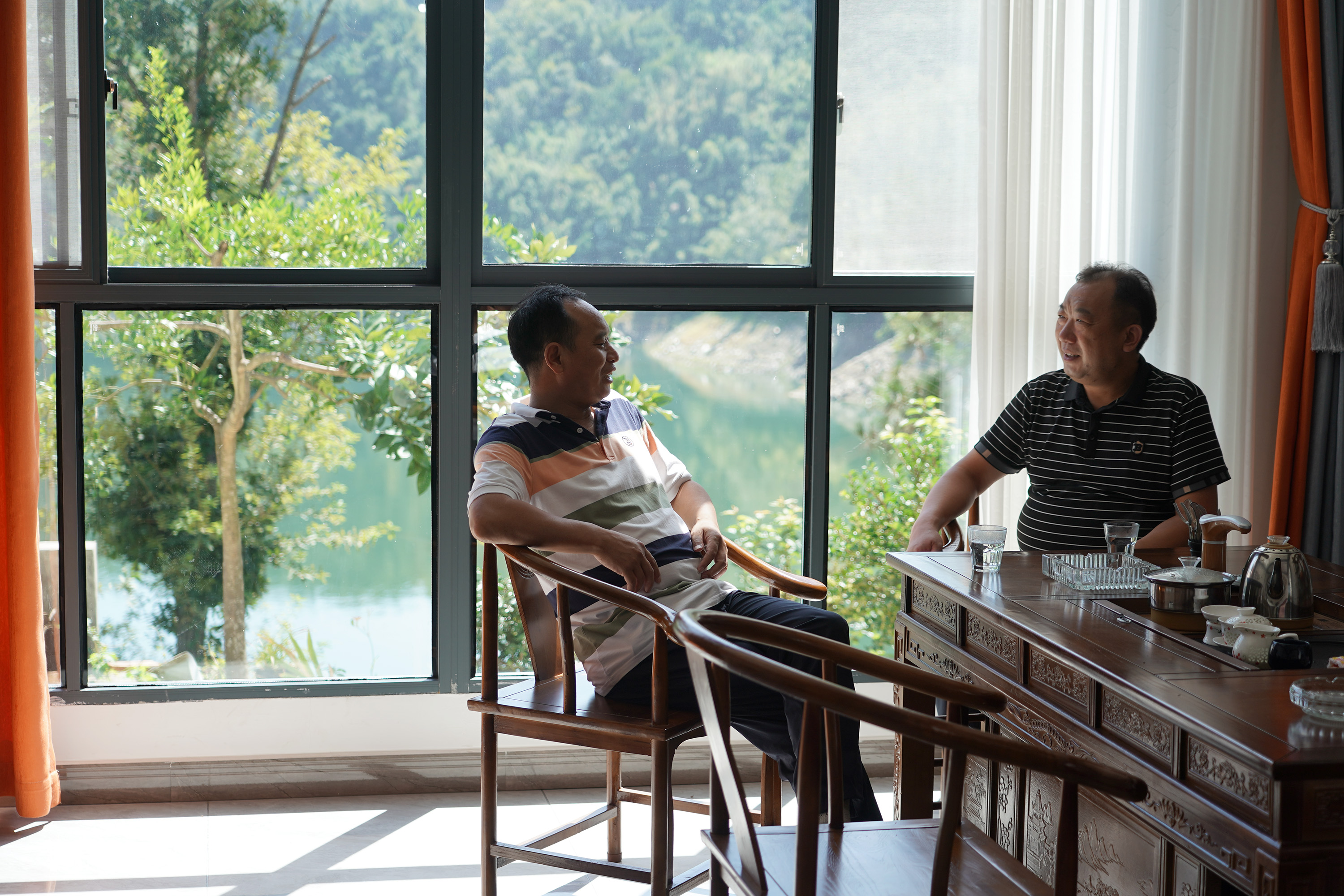 游客在安康市漢濱區(qū)漢江瀛湖邊的一家農(nóng)家樂內(nèi)休息聊天。(新華社記者 邵瑞 攝)
