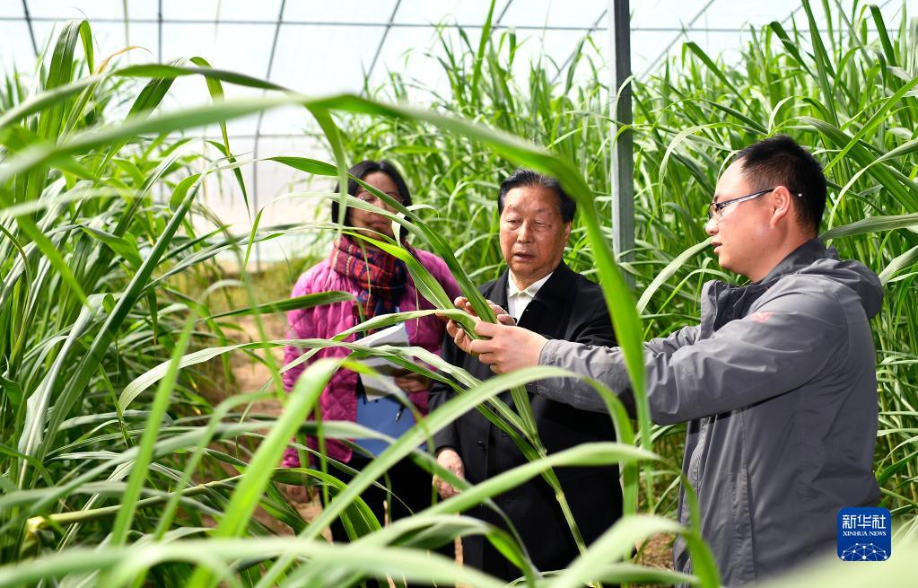 菌草專(zhuān)家林占熺(中)在寧夏銀川市永寧縣閩寧鎮(zhèn)農(nóng)戶(hù)劉昌富的大棚里查看菌草生長(zhǎng)情況(2021年3月29日攝)。新華社記者 王鵬 攝