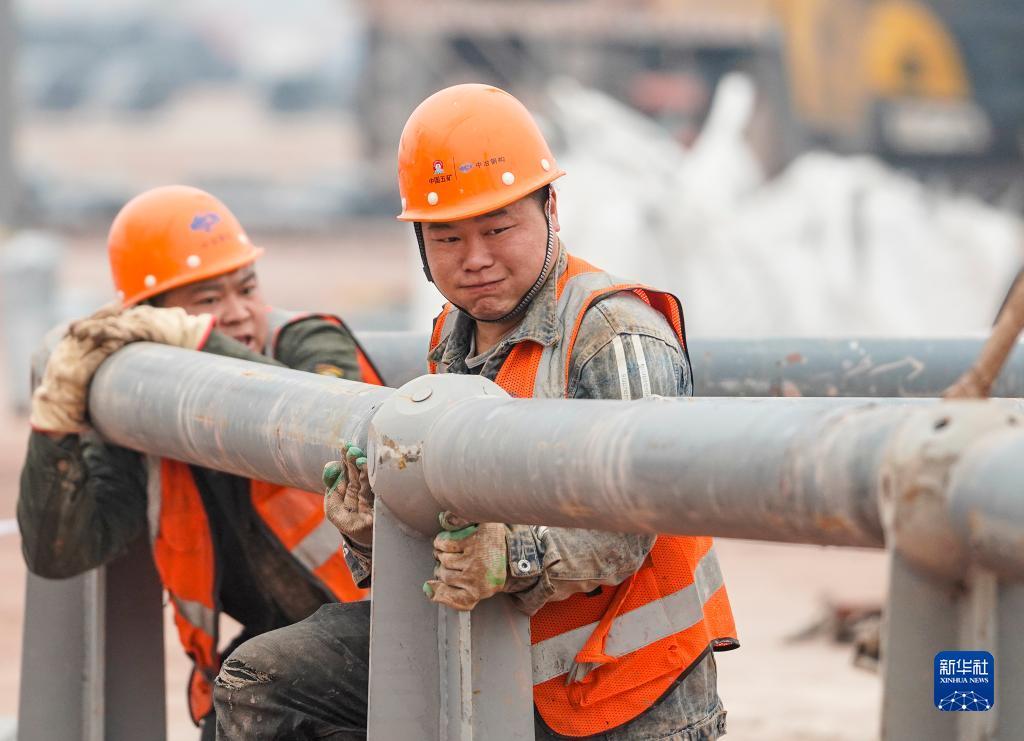 工人在重慶兩江新區(qū)新能源汽車產(chǎn)業(yè)園基礎(chǔ)設(shè)施配套項(xiàng)目現(xiàn)場進(jìn)行鋼結(jié)構(gòu)材料拼裝作業(yè)(1月23日攝)。新華社記者 劉潺 攝