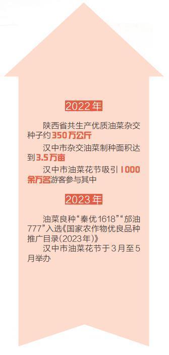 陜西是雜交油菜種業(yè)強省,雜交油菜育種研究和產(chǎn)業(yè)化開發(fā)一直走在全國前列。2022年,陜西省制定《油菜產(chǎn)業(yè)綠色革命科技三年行動實施方案》,取得明顯成效。陜西省去年全年共生產(chǎn)優(yōu)質(zhì)油菜雜交種子約350萬公斤。勉縣、城固縣、洋縣入選全國油菜產(chǎn)業(yè)綠色革命科技示范縣;陜西農(nóng)業(yè)科研單位培育的油菜良種“秦優(yōu)1618”“邡油777”入選2022年國家糧油生產(chǎn)主導(dǎo)品種和《國家農(nóng)作物優(yōu)良品種推廣目錄(2023年)》;漢中市農(nóng)業(yè)農(nóng)村局啟動糧油“百千萬”豐產(chǎn)示范工程,在全市11個縣(區(qū))建立油菜優(yōu)良品種和綠色高產(chǎn)高效生產(chǎn)技術(shù)百畝示范點56個8100畝、千畝示范片23個2.9萬畝、萬畝示范帶9個10.5萬畝;漢中市南鄭區(qū)和勉縣被農(nóng)業(yè)農(nóng)村部認定為國家級油菜制種大縣。漢中市委、市政府提出“最強產(chǎn)業(yè)、最優(yōu)種業(yè)、最美花海”的發(fā)展戰(zhàn)略,以“花”為媒,將漢中市油菜花節(jié)打造成推動鄉(xiāng)村振興和發(fā)展文化旅游的重要載體。2022年,1000余萬名游客前來觀光旅游或參與線上活動。“油菜經(jīng)濟”堪稱陜西的一張金色名片。