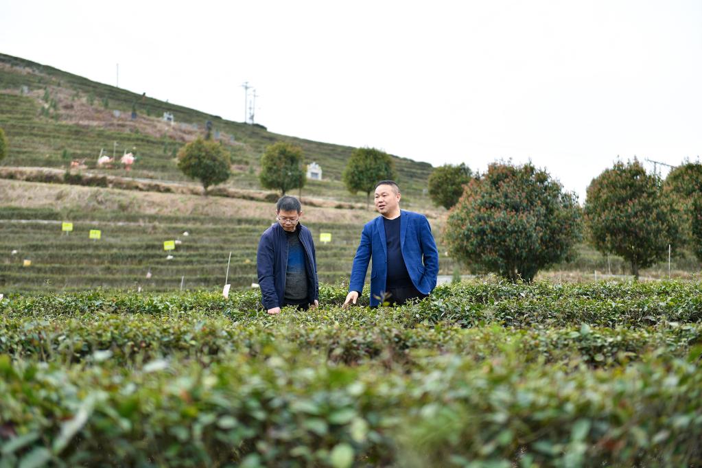 羅新亮(右)在茶園查看茶葉長勢。新華社記者陳振海 攝