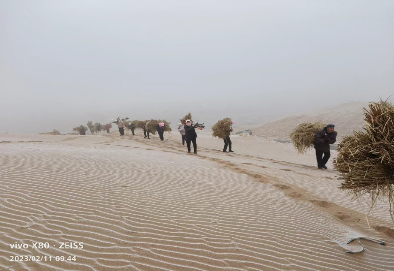 今年春季八步沙林場(chǎng)職工在麻黃塘沙區(qū)背草壓沙(八步沙林場(chǎng)供圖)