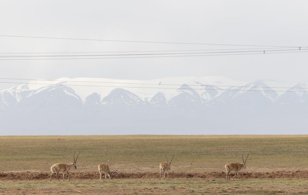 6月15日,在長(zhǎng)江源地區(qū)的楚瑪爾河附近,幾只藏羚羊在覓食。