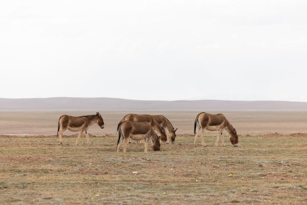 6月15日,在長(zhǎng)江源地區(qū)的楚瑪爾河附近,幾只藏野驢在覓食。