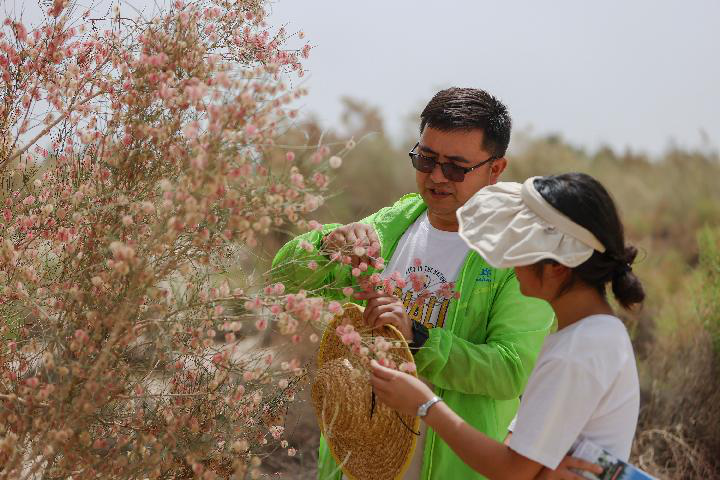 2023年6月12日,在中科院新疆生態(tài)與地理研究所策勒沙漠研究站天然試驗區(qū),買爾當和學(xué)生查看沙拐棗生長情況。新華社記者 郝昭 攝