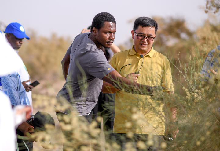 2023年6月13日,在中科院新疆生態(tài)與地理研究所策勒沙漠研究站天然實驗區(qū),中國科研人員買爾當(右一)為參加第二屆非洲綠色長城建設(shè)技術(shù)培訓(xùn)班的學(xué)員講解。新華社記者 王菲 攝