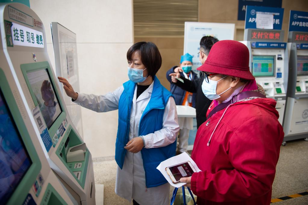 2020年12月9日,在首都醫(yī)科大學附屬北京天壇醫(yī)院,工作人員在幫助老年人使用自助機查詢號源。新華社記者 陳鐘昊 攝