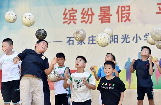 暑假期間,為減輕家長負擔,有效緩解學生暑期“看護難”問題,部分學校、社區(qū)開展暑期免費托管,為學生提供作業(yè)輔導和素質(zhì)課程等服務,讓孩子們度過一個快樂、有意義的假期。 圖為7月10日,在石家莊市陽光小學,學生進行足球訓練。張曉峰/攝(新華社發(fā))