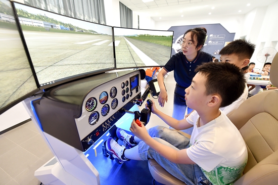 7月10日,在石家莊市融創(chuàng)中心第一小學,學生在老師的指導下進行飛行模擬駕駛。張曉峰/攝(新華社發(fā))