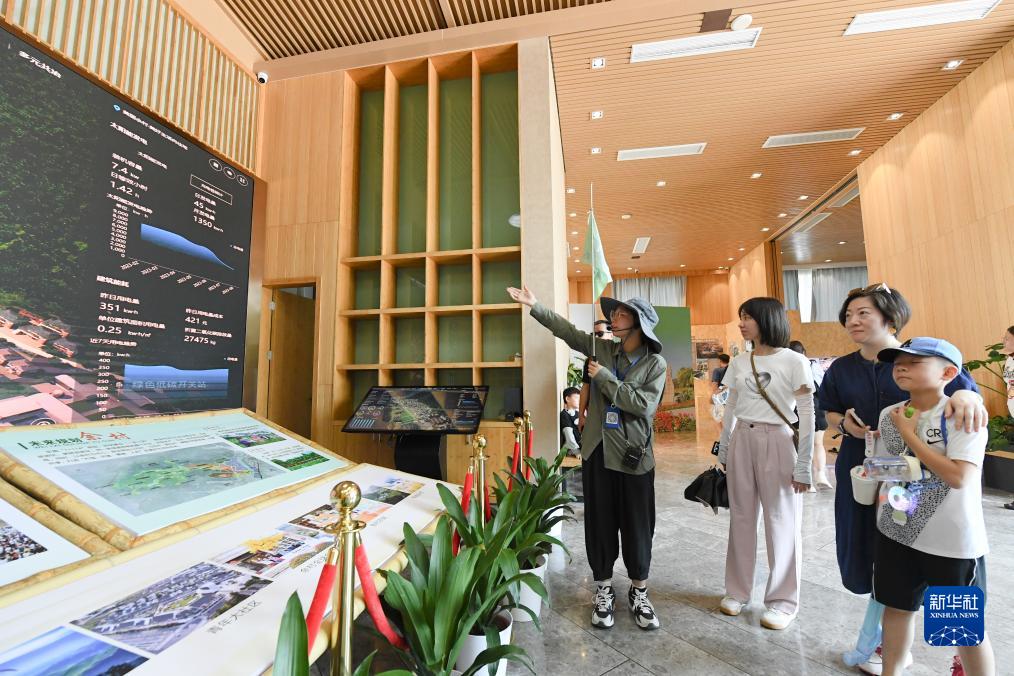8月11日,游客在安吉余村未來鄉(xiāng)村展館了解當(dāng)?shù)鼐G色用能情況。