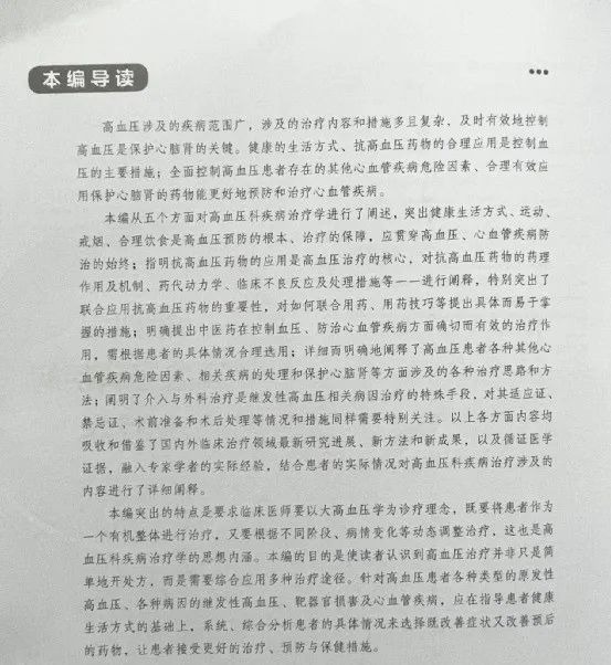 該書每一編都有一個導(dǎo)讀,指導(dǎo)讀者怎樣學(xué)習(xí)使用相關(guān)內(nèi)容,在閱讀每編、章、節(jié)前都能構(gòu)建好系統(tǒng)的理論知識框架,順利把握好各章節(jié)中的重點、難點及疑點,更好地汲取書中的教學(xué)方法及研究成果。如第四編“高血壓科疾病治療學(xué)”從健康生活方式、抗高血壓藥物、中醫(yī)藥、相關(guān)疾病處理和介入與外科手術(shù)等五個方面對高血壓科疾病治療學(xué)進行了闡述。反映了高血壓涉及的疾病范圍廣,涉及的治療內(nèi)容和措施多且復(fù)雜,及時有效地控制高血壓是保護心腦腎的關(guān)鍵。健康的生活方式、抗高血壓藥物的合理應(yīng)用是控制血壓的主要措施;全面控制高血壓患者存在的其他心血管疾病危險因素、合理有效應(yīng)用保護心腦腎的藥物能更好地預(yù)防和治療心血管疾病。