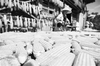 8月11日,在貴州省黔東南苗族侗族自治州從江縣往洞鎮(zhèn)增沖村,村民在晾曬玉米。新華社發(fā)(羅京來(lái)攝)
