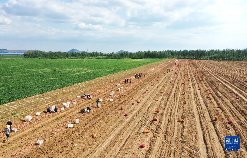 8月28日,灤州市九百戶鎮(zhèn)一家鮮食紅薯種植合作社的社員在田間收獲煙薯(無人機(jī)照片)。
