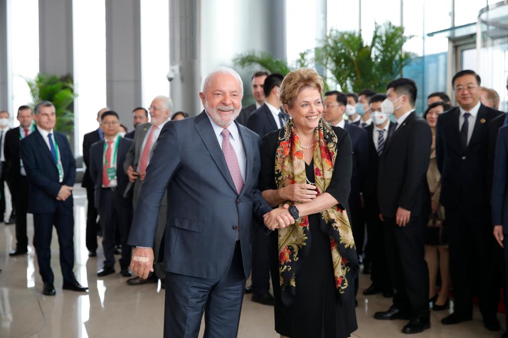 4月13日,巴西總統(tǒng)盧拉在新開發(fā)銀行總部與新開發(fā)銀行新任行長、巴西前總統(tǒng)羅塞夫女士親切握手。(新華社記者高峰攝)