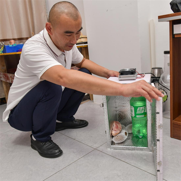 只有初中文憑的楊波就開始學(xué)習(xí)冰箱知識,了解冰箱原理結(jié)構(gòu):為什么會制冷還能調(diào)節(jié)溫度?等等,做到了了然于胸,又購買了冷卻片、制冷片、散熱片、風(fēng)扇、溫度計、封條等必備用料,自己又在工地找到了廢棄的塑膠板,在家具店里找來隔熱錫紙,經(jīng)過一番折騰,一臺高60 厘米、寬40厘米、厚40厘米的手工小冰箱做成功了。使用2個月來,最低溫度可達(dá)2攝氏度。效果非常好!