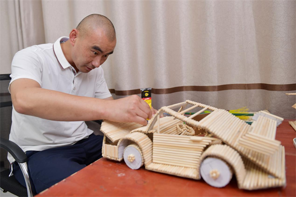 編制了一段時間的小手鏈、小掛件、小燈籠等等小工藝品后,楊波購買了一次性筷子自己做了一個煙盒。這個煙盒只要一按按鈕,煙支就會自動彈出,而且煙嘴朝上。隨后,楊波又購買了許多一次性筷子,做一輛轎車模型,不曾想,等到了安裝擋風(fēng)玻璃時,小轎車散架了。分析原因,是因?yàn)閳A柱狀筷子之間的粘和面積太小不牢靠。楊波找了一些紙板當(dāng)墊板,使筷子的粘和面變成2處,牢固程度提高1倍,前前后后有10多天,一輛筷子車模做成功了。