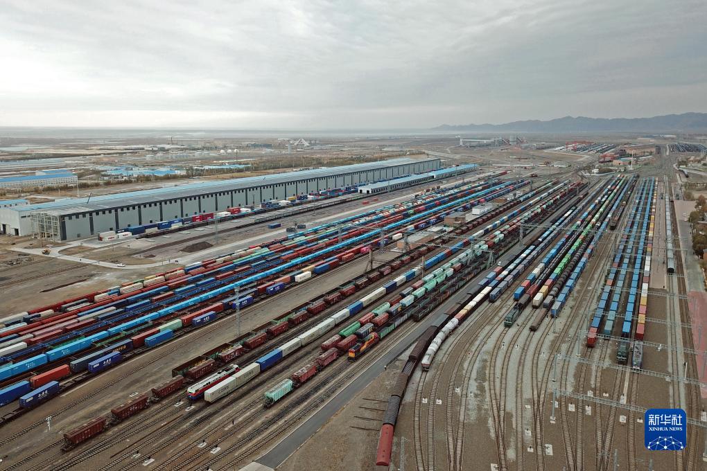 這是在阿拉山口站編組場(chǎng)拍攝的集結(jié)待發(fā)的貨運(yùn)列車(無(wú)人機(jī)照片,11月4日攝)。新華社記者 李鑫 攝