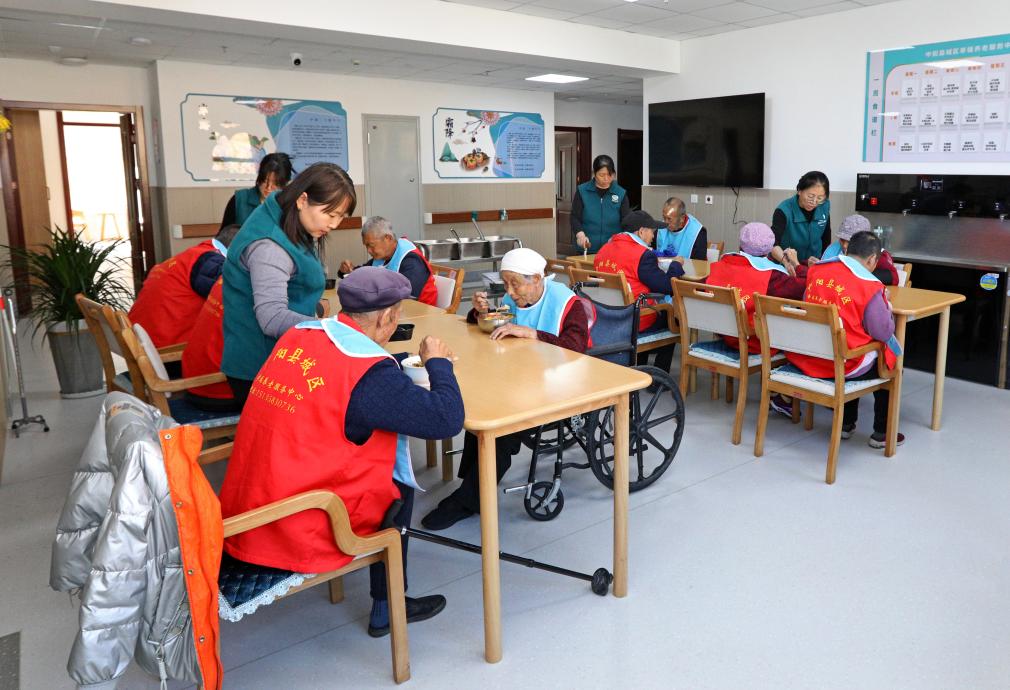 2023年11月18日,中陽(yáng)縣城區(qū)幸福養(yǎng)老服務(wù)中心老年人在就餐。張旭盛 攝