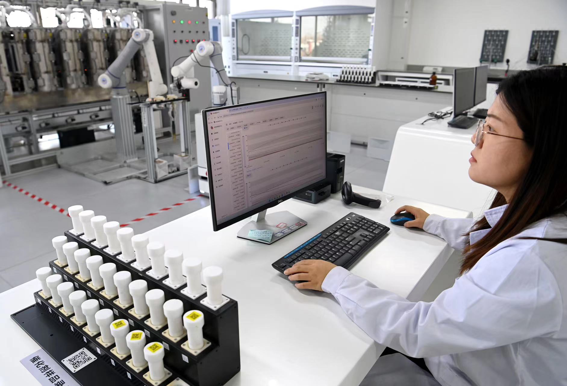 2月28日,在榆林中科潔凈能源創(chuàng)新研究院基于人工智能的高通量催化反應(yīng)研究平臺實驗室,工藝專干黨小梅在進(jìn)行實驗。新華社記者鄒競一 攝