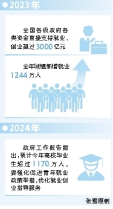 2023年,全國(guó)各級(jí)政府各類資金直接支持就業(yè)、創(chuàng)業(yè)超過(guò)3000億元,并采取支持高校畢業(yè)生等青年就業(yè)、城鄉(xiāng)困難群眾就業(yè)等針對(duì)性措施,全年城鎮(zhèn)新增就業(yè)1244萬(wàn)人。