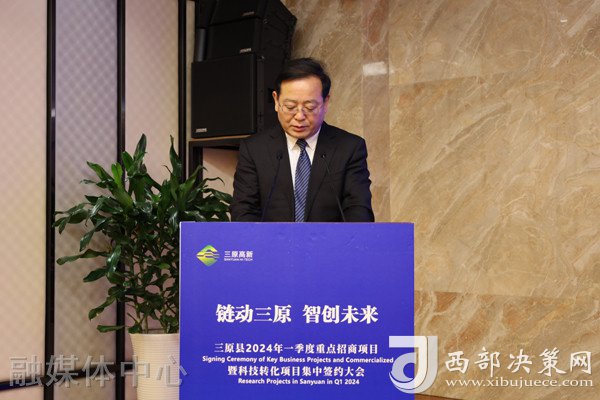 西部決策網(wǎng)訊 近日,“鏈動三原 智創(chuàng)未來”三原縣2024年一季度重點招商項目暨科技轉(zhuǎn)化項目集中簽約大會在咸陽市舉行。省市領(lǐng)導汪文展、李曉靜、吳進武、仝保亞、王春霄、程文杰、曾亞龍等出席活動。縣委書記趙俊強致辭。縣委副書記、縣長楊紅剛主持??h委常委、常務(wù)副縣長蒙小衛(wèi)等介紹簽約項目情況。投資企業(yè)、項目單位負責人等100余人出席活動。