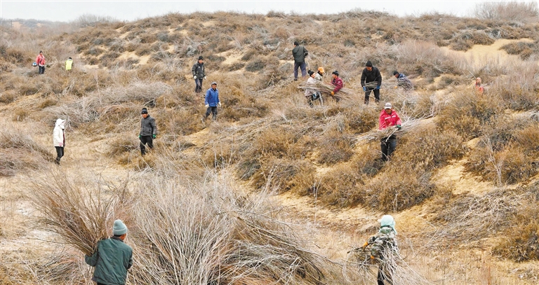 3月5日,在榆林市榆陽(yáng)區(qū)小壕兔鄉(xiāng)掌高兔村,技術(shù)人員在進(jìn)行沙柳平茬作業(yè)。