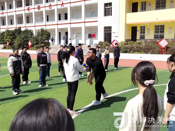 康陽(yáng)陽(yáng)老師在體育匯報(bào)課上為學(xué)生講解排球擊球要領(lǐng)