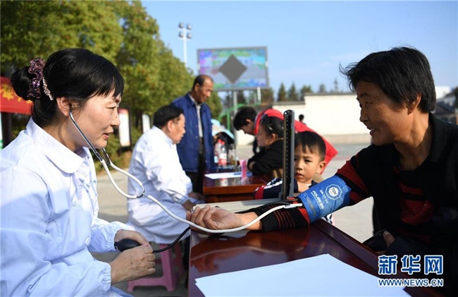 11月4日,安徽醫(yī)科大學第一附屬醫(yī)院的醫(yī)生為村民體檢。 當日,安徽省肥西縣豐樂鎮(zhèn)邀請安徽醫(yī)科大學第一附屬醫(yī)院的醫(yī)生來到鄉(xiāng)村,免費為周邊村民提供醫(yī)療咨詢、健康體檢、醫(yī)療保健等衛(wèi)生服務(wù)。新華社記者劉軍喜攝 11月4日,安徽醫(yī)科大學第一附屬醫(yī)院的醫(yī)生為村……